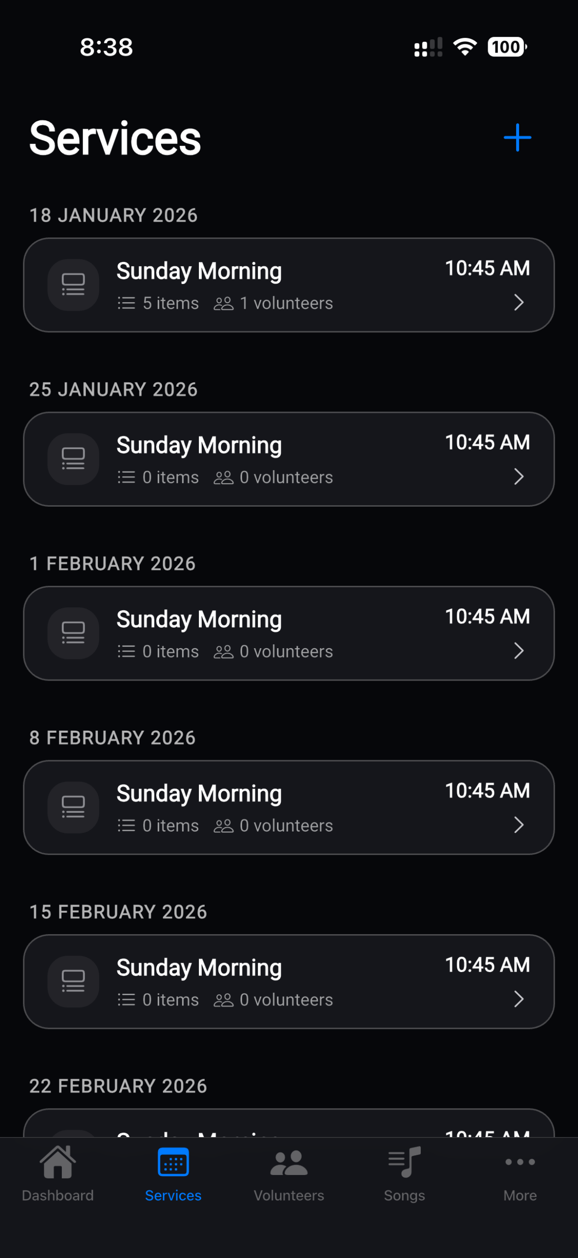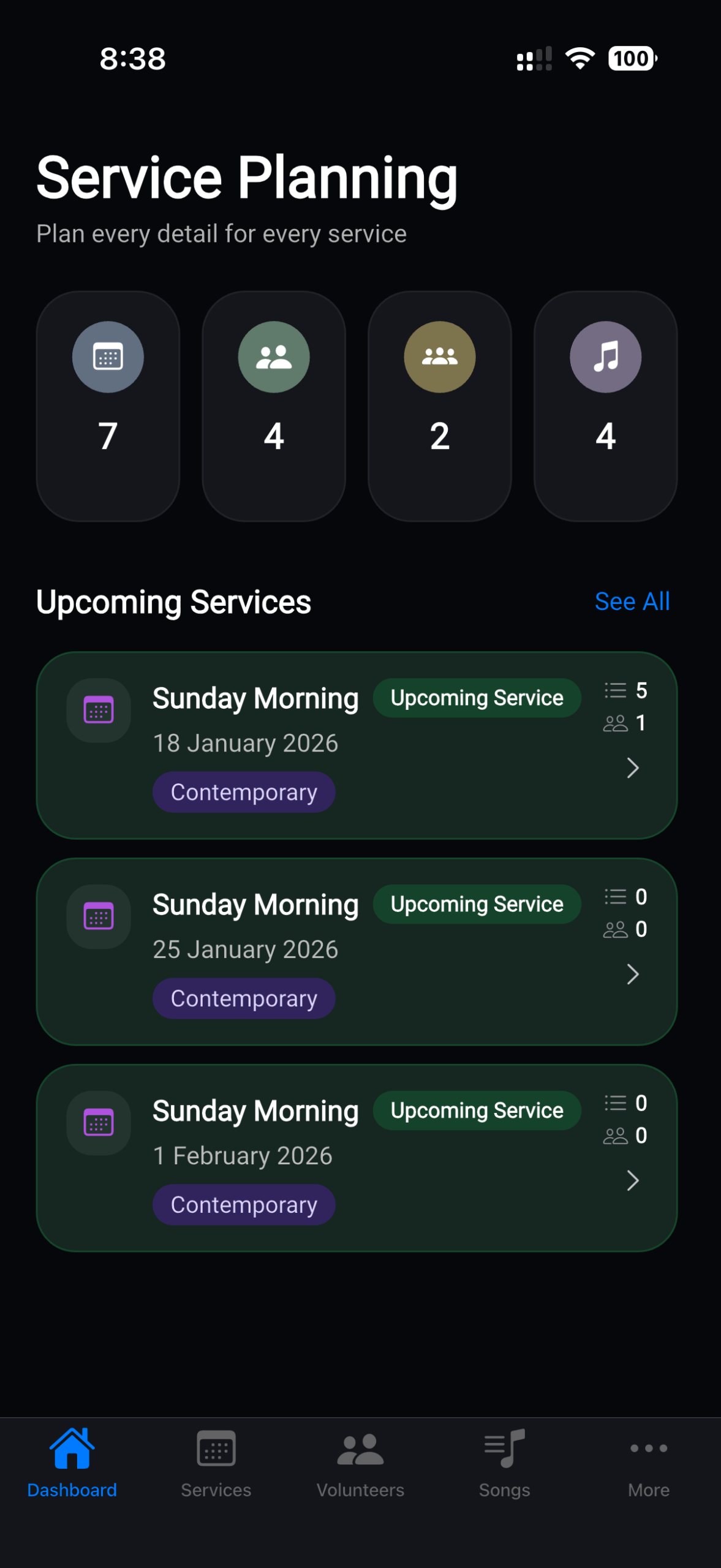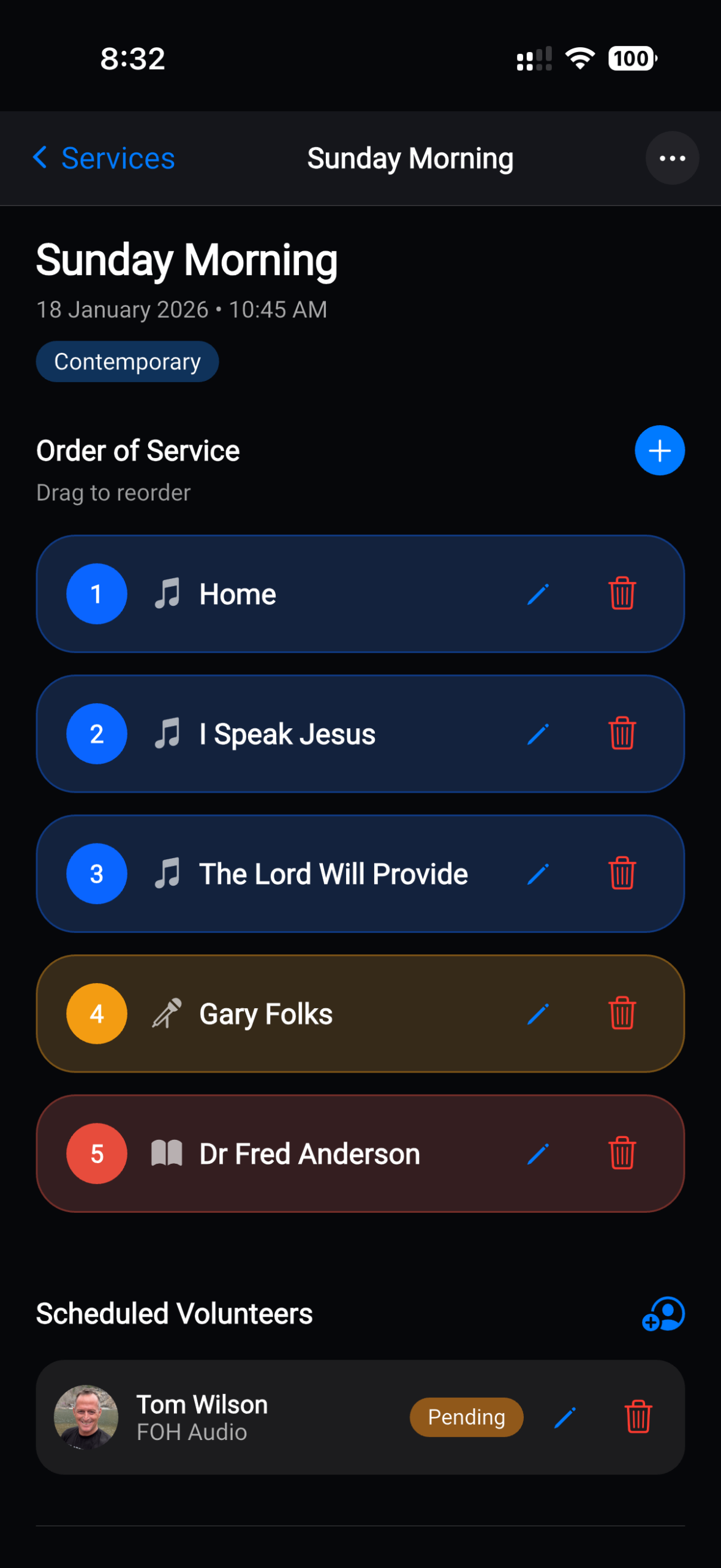 The Worship Schedule App makes it easy to plan and manage multiple services in one place. Whether your ministry hosts identical back-to-back services, separate contemporary and traditional gatherings, or mid-week events, you can create and organize each service with its own flow, songs, notes, and volunteer assignments.